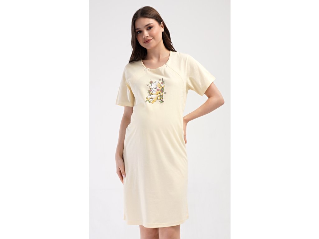 Dámská bavlněná mateřská noční košile s medvídky. Noční košile je svým střihem určená na dobu těhotenství, do porodnice i ke kojení. Ke kojení slouží průstřihy po stranách košile, které jsou uzavíratelné na zip. Použitý materiál s podílem bavlny 100% je příjemný a poddajný na dotek.